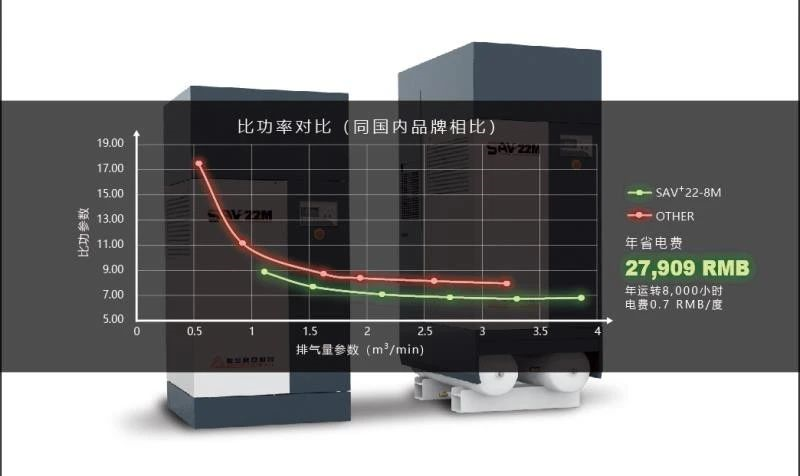 如我,以22kW,0.8MPa空压机为例,相较于国内,都处于100%输出状态时,我的气量将超过同类产品的大输出量;而都处于70-80%变动输出时,在输出同等气量下,我能比对方年节省近3万元(年运行8000hr,每度电0.7RMB)。